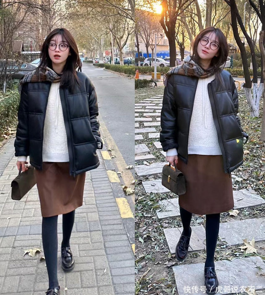 举例上图这身穿搭中,深咖色的半身裙不错使造型开释出优雅好意思艳的韵味,配合玄色打底裤的话,又能保证腿部存留的暖意。