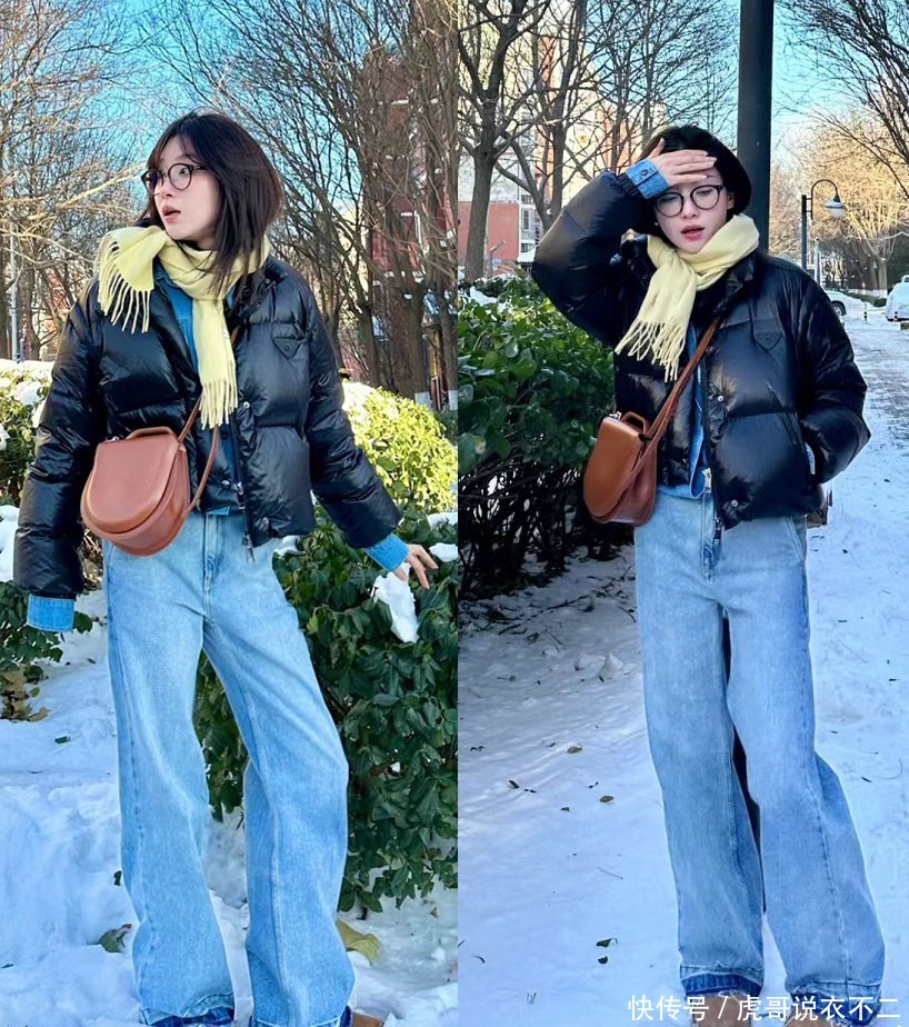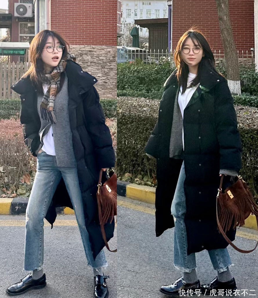 反而基础色更能营造出视觉上的勤俭感,譬如说上图这件玄色的长羽绒服,在平方穿搭起来很是放荡,配牛仔裤穿理会又帅气。