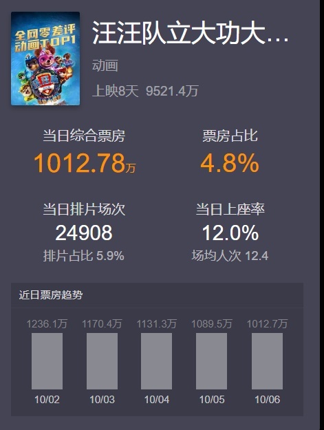 暑期档的热络,让部分业内东谈主士对国庆档也抱有好的预期(40亿)。不外在国庆档行将驾临之际,其实不少东谈主也都调低了预期。12部新片莫得出现票房破10亿的黑马,6部动画片均没能冲破1亿元大关,只须3部向上一千万元,分辨为《汪汪队立大功大电影2:超能大冒险》的9518万元、《贝肯熊:火星任务》的5789万元和《我是哪吒2之骁雄归来》的1477万元。莫得“爆款”的国庆档,开启了10月的电影阛阓。
