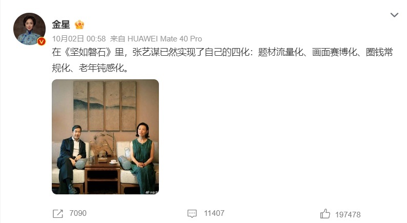 10月2日凌晨0点58分,影星金星在微博发文称,在《坚如磐石》里,张艺谋果决罢了了我方的四化:“题材流量化、画面赛博化、圈钱旧例化、老年钝感化。”她的言论引起等闲热议。10月5日,作者六神磊磊就金星的月旦,在微博反驳《坚如磐石》是“流量化”“圈钱化”或者是“老年钝感”。他招供了张艺谋在抒发措施上的探索,称看到了这内部的勇气和价值。目下,《坚如磐石》官方未对金星的言论作念出恢复。
