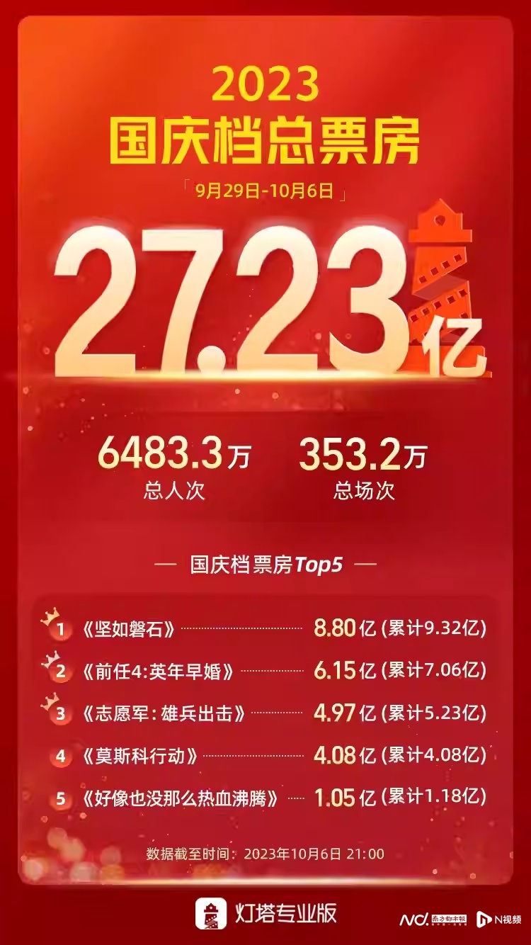 本年国庆档紧挨中秋档,部分影片于9月28日启动上映,趁势延长了国庆档期。2023年国庆档27.23亿总票房高于2022年的14.97亿,但远低于的2019年的44.66亿、2020年的39.67亿和2021年的43.88亿。